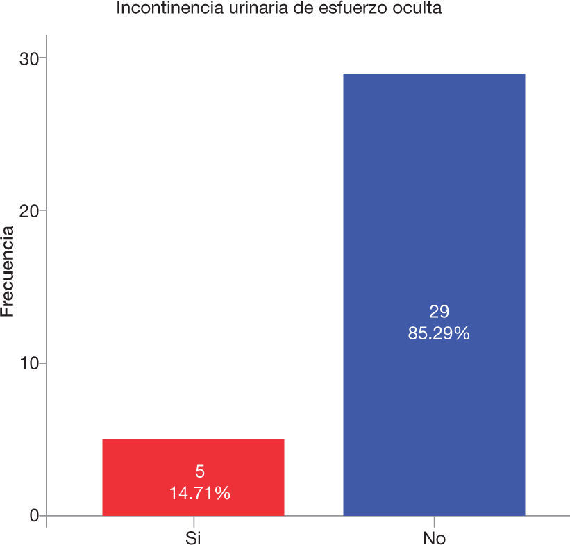 De las 34 pacientes, 29 (85%) presentaron ALPP positivo y en 5 fue negativo aún sin sonda transuretral (14.7%), lo que se considera como IUE oculta o tipo 0, es decir, no demostradas urodinámicamente (fig. 3).