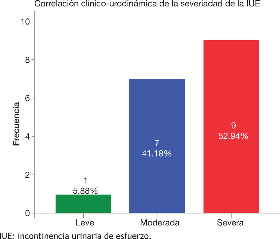 Dado que las pacientes fueron referidas por sus médicos tratantes, la evaluación clínica de la severidad de la incontinencia así como la calidad de vida fue llevada a cabo con el cuestionario ICIQ UISF validado en el Reino Unido3; de acuerdo al score, la incontinencia fue clasificada como leve, moderada o severa. Se determinó la correlación clínico-uro-dinámica considerando los valores del punto de presión de fuga abdominal, que de acuerdo a los estándares establecidos, se dice que cuando es mayor a 60 cm/H2O corresponde a hipermotilidad uretral y cuando es menor a dicha cifra, correlaciona con deficiencia intrínseca del esfínter externo, para la presión máxima de cierre uretral los valores son más de 20cm/H2O y menos de 20cm/H2O, respectivamente.
