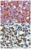 Figura 1 Vista al microscopio con marcadores de inmunohistoquímica positivos para Ki67 y Bcl-6.