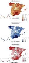 Distribución geográfica de los suicidios en las provincias españolas entre los años 2000 y 2012 (se representa la mediana de las tasas anuales normalizadas). En orden descendente: el mapa superior representa los suicidios totales, el mapa del medio corresponde a los suicidios en varones, y el mapa inferior corresponde a los suicidios en mujeres.