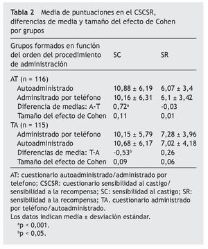 El objetivo principal del presente estudio fue determinar la validez de procedimiento de la administración telefónica del cuestionario sensibilidad al castigo/sensibilidad a la recompensa (CSCSR) en una muestra de sujetos de atención primaria (AP). El CSCSR es un cuestionario autoadministrado diseñado para evaluar las diferencias individuales en la actividad del SAC y el SIC (una descripción detallada de este instrumento puede consultarse en otros artículos12,13. Además, se evaluaron otros dos aspectos: a) hasta qué punto las diferencias en la media de las puntuaciones obtenidas entre los dos procedimientos de evaluación podían estar relacionadas con la diferencia en la modalidad de administración del instrumento o con el hecho de responder al mismo instrumento en dos oportunidades, y b) la consistencia interna del cuestionario administrado telefónicamente en comparación con la consistencia interna del cuestionario aplicado en formato autoadministrado.