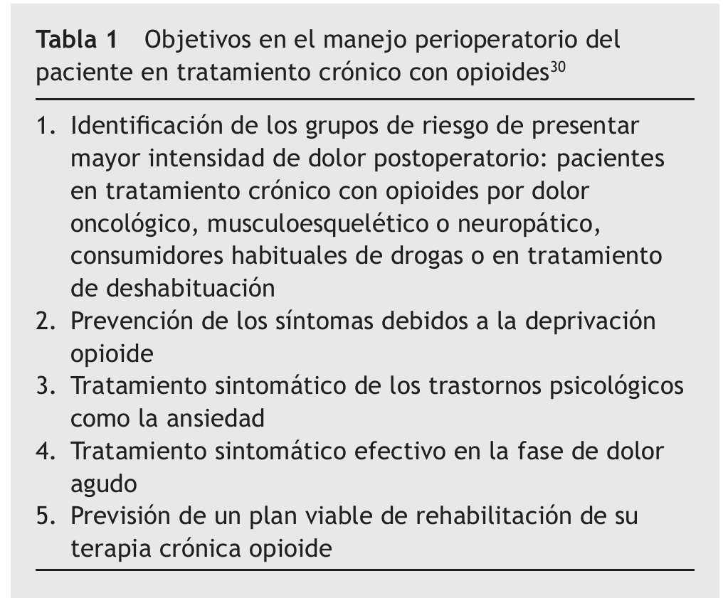 El manejo intraoperatorio del paciente consumidor crónico y, por tanto, tolerante a los opioides está habitualmente determinado por el tipo de fármaco, la dosis diaria requerida, la interacción con el resto de las medicaciones, la naturaleza y el estadio de la enfermedad de base y, por supuesto, en el tipo de cirugía propuesto. Sin embargo, a pesar de que no existe una técnica anestésica ideal, es necesario mantener una dosis basal de opioide (oral, transdérmica, iv) y esperar un aumento de los requerimientos analgésicos41. También es muy útil la realización de anestesia regional, tanto neuroaxial (epidural, intratecal) como periférica (plexos nerviosos), o la infiltación de la herida quirúrgica mantenida de manera continua en el período postoperatorio8. En caso de realizar una anestesia general, se recomienda una técnica anestésica balanceada utilizando fármacos neuromoduladores, como ketamina (0,25 mg/kg-1) y el óxido nitroso, ambos con acción anti-NMDA, analgésicos no opioides y una infusión continua de opioides como fentanilo en su dosis efectiva mínima, ya que se ha comprobado en pacientes no dependientes de opioides que las perfusiones intraoperatorias en dosis altas de remifentanilo o fentanilo pueden producir un fenómeno de rápida tolerancia e hiperalgesia postoperatoria, junto con un aumento del consumo de analgésicos postoperatorios42.