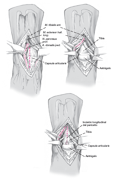 Se avanza en profundidad entre los tendones del tibialis anterior y el extensor hallucis longus. Los tendones extensores se separan en sentido lateral con un Langenbeck protegiendo