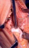 Tal y como se ha descrito previamente, se corta el cartílago con un bisturí. Se coloca un periostótomo de 0,5 cm de anchura en el espacio articular.