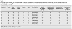 La duración media del seguimiento fue de 29 meses (24-36 meses; tabla 1). La Escala de Tobillo de Friburgo8 mejoró de 54 puntos en el preoperatorio (36-67 puntos) hasta 92 puntos en el momento del seguimiento (85-100 puntos) (tabla 2). Por tanto, la mejoría media fue de 38 puntos.