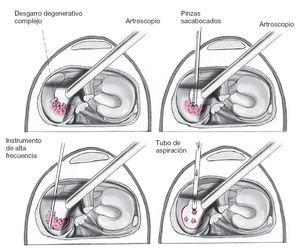Introducción del artroscopio mediante un portal anterolateral o central. El portal de instrumental se coloca en concordancia con la situación de la lesión meniscal a ser tratada. El tejido que ha de extraerse es o bien seccionado en fragmentos con distintos punzones o bien resecado en bloque.