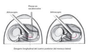 - La lesión meniscal en el cuerno posterior no puede al-canzarse con las pinzas sacabocados: ha de hacerse una nueva entrada del instrumento.