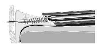 Figura 10. Girando en la dirección de las agujas del reloj el mango del extremo proximal de la guía, se inserta el tornillo. Para este paso se debe mantener presionada la cánula. La introducción del tornillo se puede confirmar a través de una ranura que existe en la parte distal de la cánula.