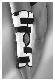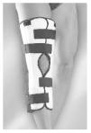 * Se coloca en el quirófano una férula en extensión, como la ortesis Medicom-Classic® (Medi Co, Christian-Ritter-von-Langheinrich-Strabe 24, 95448 Bayreuth, alemania; fig. 14), y se mantiene la pierna elevada sobre un plano inclinado. Sólo al final de la sexta semana se autoriza una carga total, en extensión completa, con una ortesis para proteger el menisco. Se autoriza la movilización del paciente en el día 1. Durante las primeras 2 semanas se autoriza ejercicios de 0 a 30º, y al final de la sexta semana de 0 a 60º. Se realiza fisioterapia ambulatoria 2 o 3 veces a la semana para la movilidad articular y recuperar la fuerza de los músculos que estabilizan la rodilla. Si aparece tumefacción en la rodilla se realizará un drenaje linfático manualmente.