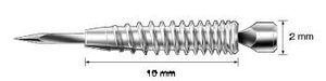 Figura 2. El tornillo meniscal Clearfix® es de ácido poliláctico (APL) y tiene un tiempo de degradación de 12-18 meses. Mide 10 mm de longitud y tiene un diámetro de 2 mm; es canulado, de sección interna cuadrada, y se afirma en la aguja cuadrada del conductor. El paso de rosca decrece en dirección a la punta del tornillo, permitiendo así una compresión de la rotura.