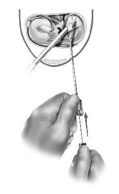 Figura 8. El tornillo meniscal Clearfix® se aplica en la aguja flexible de la guía. Mientras el ayudante sostiene la cámara, el cirujano introduce el tornillo sostenido por la guía a través de la cánula. Para este paso se recomienda mantener la guía hacia arriba para que no se suelte el tornillo. Este dibujo ilustra la extracción del tornillo de su envoltorio.
