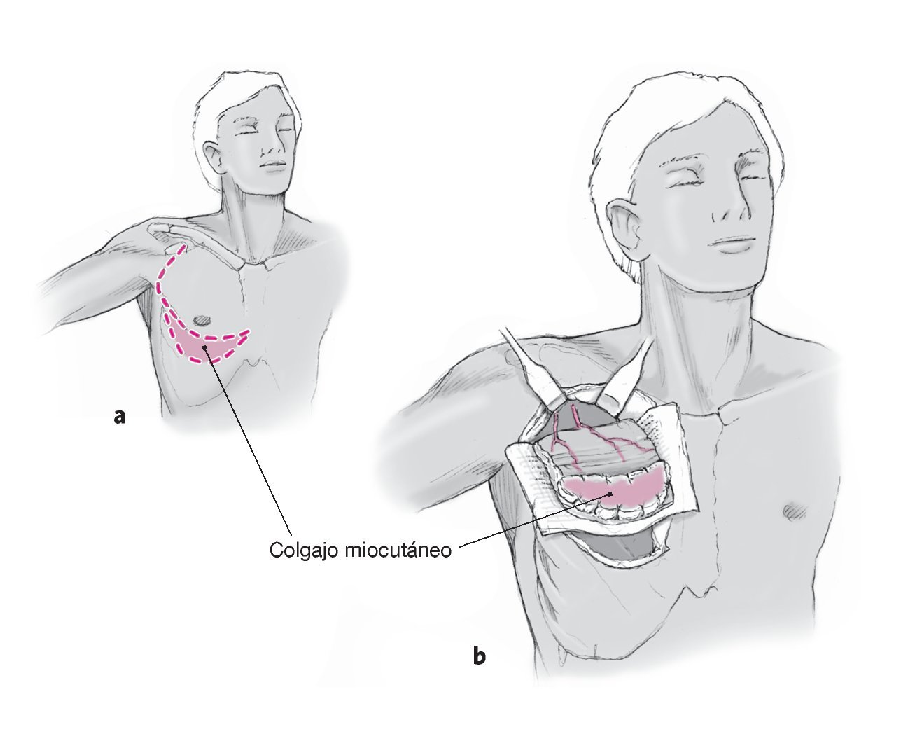 El defecto de la zona donante tras la plastia de colgajo miocutáneo es muy pronunciado y sólo está justificado cuando, por motivos funcionales y de seguridad, es imprescindible cubrir el defecto con varias capas.