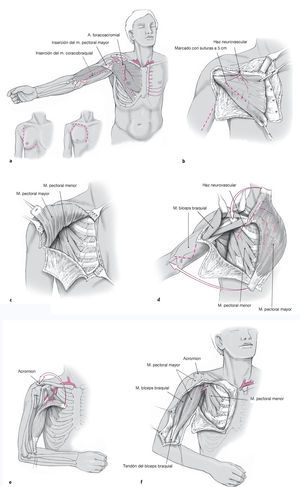 Figuras 2a a 2f Transposición muscular distal: transposición del origen del m. pectoral: porción abdominal, porción esternocostal y porción clavicular (transferencia distal unipolar o bipolar, parcial o completa). Para la presentación de las estructuras en las zonas donante (tórax) y receptora (brazo) se practican dos incisiones cutáneas. En el tórax, la incisión se extiende hacia distal desde el acromion hasta la séptima costilla a lo largo del borde axilar del músculo pectoral mayor. En las mujeres, esta incisión deberá discurrir por la zona del pliegue submamario. Alternativamente, puede practicarse una incisión paralela debajo de la clavícula y paraesternal hacia distal. De este modo se facilita la visualización, aunque también aumenta el riesgo de una cicatrización inadecuada (cicatriz hipertrófica, queloide). En el brazo, se practica una incisión anterior recta o sinuosa para la exposición del tendón distal del bíceps. Para simplificar el procedimiento, pueden unirse las dos incisiones (a). A continuación se presenta el músculo pectoral mayor. La piel que cubre el músculo se diseca hasta el esternón. Debe efectuarse una hemostasia cuidadosa. Tras la colocación de las marcas de sutura (distancia de 5 cm) para determinar la tensión muscular inicial en reposo, puede liberarse el músculo de la pared torácica y de la clavícula (b). Se comienza por el extremo distal en la zona de la porción abdominal. Para mejorar la refijación del músculo, se traslada conjuntamente una parte de la hoja anterior de la vaina aponeurótica del recto. En la preparación desde caudal hacia craneal deberán ligarse las ramas perforantes de la arteria torácica interna. Durante la preparación hacia proximal debe conservarse el pedículo neurovascular, que discurre por la cara inferior del músculo pectoral mayor. Dado que es frecuente que el pedículo neurovascular inferior (nervios pectorales mediales y vasos colaterales) atraviese el músculo pectoral menor, pueden surgir problemas en la preparación. En estos casos se lleva a cabo una división del músculo pectoral menor o una transferencia parcial, en la que la porción no transferida conserva más o menos su función. Basándose en esta experiencia y teniendo en cuenta que el músculo pectoral menor, aunque adecuado para ser transferido solo27, es demasiado débil, Tsai et al44 describieron la transposición combinada de ambos músculos para el restablecimiento de la flexión activa del codo. Finalmente se secciona la inserción humeral del músculo pectoral mayor cerca de la cresta del tubérculo mayor. El vientre muscular voluminoso se conforma cilíndricamente y el músculo pediculado se gira 90º en el sentido de las agujas del reloj (c). Una vez obtenido el colgajo muscular, se forma un túnel subcutáneo en la zona del brazo dividiendo, en caso necesario, la fascia braquial. Tras seccionar la aponeurosis bicipital se expone el tendón distal del bíceps. La resección del músculo bíceps paralítico sólo está indicada en situaciones excepcionales. La porción del tendón distal del bíceps se necesita para fijar el músculo pectoral, por lo que deberá conservarse (d). El músculo pectoral se coloca en su nueva posición vigilando que el haz neurovascular discurra sin tensión ni presión. En primer lugar se realiza el anclaje distal. La porción de la hoja anterior de la vaina aponeurótica del recto se entrelaza con el tendón distal del bíceps con suturas no reabsorbibles. Para la refijación proximal, la articulación del codo se mantiene en flexión de aproximadamente 130º a fin de lograr una tensión inicial suficiente (e). La tensión muscular inicial en reposo quedará restablecida cuando las suturas marcadoras colocadas al comienzo de la intervención vuelvan a encontrarse a una distancia de 5 cm. El tendón del músculo pectoral mayor se refija en la zona del acromion, la clavícula periférica o la apófisis coracoides con material de sutura no reabsorbible. Por último, debe controlarse de nuevo la tensión del pedículo neurovascular en la parte craneal de la incisión cutánea a lo largo del tórax. Tras colocar los correspondientes drenajes de Redon en las zonas donante y receptora, se cierra la herida por capas y se aplica un vendaje compresivo estéril. En la zona de la axila se coloca una compresa para evitar que el sudor provoque una maceración excesiva. La inmovilización postoperatoria se realizará con una férula de escayola en el brazo, un vendaje de Gilchrist o una ortesis de abducción toracobraquial con el codo en flexión de 90º y supinación (descarga de las suturas distales) y un vendaje en el hombro (para evitar la abducción del hombro) durante 6 semanas. La ortesis o férula de escayola del brazo debe colocarse bajo anestesia, ya que durante la extubación el paciente puede realizar movimientos incontrolados y arrancar la transferencia. Para el reposo postoperatorio en cama se colocará un cojín debajo del codo.