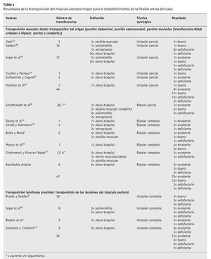 Un metaanálisis de la bibliografía refleja que sólo se dispone de series pequeñas y no homogéneas en cuanto a los siguientes aspectos: la etiología (lesiones del plexo, pérdida muscular traumática directa, poliomielitis, artrogriposis, etc.), la situación de partida (pérdida completa de la flexión del codo/M0, pérdida parcial de la flexión del codo/M1, M2), la técnica de transposición (transposición unipolar parcial según Clark13, transposición bipolar parcial según Schottstaedt et al36, transposición bipolar completa según Dautry et al14 o Carroll y Kleinmann10, transposición bipolar completa con el músculo pectoral menor según Tsai et al44, transferencia tendinosa proximal unipolar completa del pectoral mayor según Brooks y Seddon8) y las intervenciones adicionales (cirugía reparadora de la rotación externa del hombro por transposición del músculo dorsal ancho y del músculo redondo mayor, artrodesis glenohumeral).