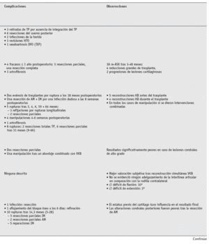 Tabla 1 Resultados tras trasplante de menisco: seguimiento de al menos 10 pacientes tras un promedio > 2 años. AM: menisco externo; ASK: artroscópico/artroscopia; DFO: osteotomía distal de fémur; HKB: ligamento cruzado posterior; HTO: osteotomía de tibia proximal; IKDC: International Knee Documentation Committee (a: anormal; n: normal; nn: casi normal; sa: muy anormal); IM: menisco interno; KB: ligamento cruzado; TEP: prótesis total; TP: trasplante; VAS: escala analógica visual; VKB: ligamento cruzado anterior. (cont)