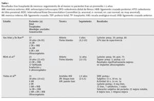 Tabla 1 Resultados tras trasplante de menisco: seguimiento de al menos 10 pacientes tras un promedio > 2 años. AM: menisco externo; ASK: artroscópico/artroscopia; DFO: osteotomía distal de fémur; HKB: ligamento cruzado posterior; HTO: osteotomía de tibia proximal; IKDC: International Knee Documentation Committee (a: anormal; n: normal; nn: casi normal; sa: muy anormal); IM: menisco interno; KB: ligamento cruzado; TEP: prótesis total; TP: trasplante; VAS: escala analógica visual; VKB: ligamento cruzado anterior.