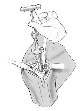 Ensanchamiento progresivo del canal humeral con fresas, hasta que haya contacto cortical, o bien hasta que se haya alcanzado proximalmente el diámetro diafisario máximo a nivel del plano de resección. Si no se puede alcanzar un contacto cortical distal con la fresa más gruesa (núm. 4), se debe cementar el componente humeral.