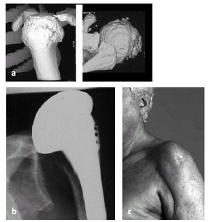 Varón de 72 años de edad. Cirugía inicial: descompresión subacromial y reconstrucción del manguito de los rotadores para los desgarros masivos. Desarrollo postoperatorio de una artropatía por desgarro del manguito con inestabilidad anterosuperior glenohumeral secundaria a una rerrotura masiva del manguito de los rotadores. Ausencia de soporte craneal para la cabeza humeral debido a una acromioplastia extensa (a). Tras la hemiartroplastia y la reconstrucción repetida del manguito de los rotadores se produjo una rerrotura con una inestabilidad glenohumeral anterosuperior manifiesta (b, c).