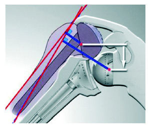 El brazo de palanca del deltoides está conservado o aumentado gracias a una medialización ligera del centro de rotación.