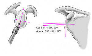 Se coloca la aguja guía de tal manera que quede perpendicular a la superficie de la glenoides en todos los planos. Dicha aguja guía se angula 5º en sentido inferior y anterior siempre y cuando la reserva ósea sea suficiente y la anatomía de la glenoides sea normal. Debe evitarse toda angulación en sentido craneal. En casos de alteración de la anatomía glenoidea, la aguja debe seguir exactamente el eje central de la glenoides. Si esto condiciona una resección excesiva de hueso, la dirección de la aguja guía puede modificarse aproximadamente 5-10º en dirección al área defectuosa. Esto puede producir una inclinación posterior, con una cierta pérdida de rotación postoperatoria. Los defectos extensos de la glenoides pueden requerir la utilización de injertos corticoesponjosos o pueden contraindicar el uso de una prótesis Delta.