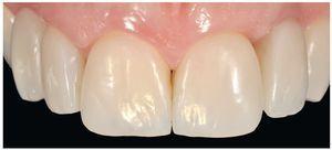 Figura 3 El caso terminado tras la reconstrucción con composite, realizada tras la cicatrización de los tejidos gingivales.