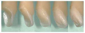 Se reprodujeron tres dientes de composite con grosores homogéneamente distribuidos de material con cada marca de composite, por lo que los resultados fueron fáciles de comparar (figuras 30 y 31). Los datos recogidos por los autores durante esta experiencia ciertamente son empíricos, pero se acercan mucho a la realidad clínica del ejercicio cotidiano de la odontología. Por ello, se consideró que aportó valor a las aseveraciones anteriores.