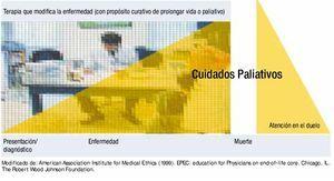 Figura 1. En las enfermedades crónicas e incurables, en la actualidad se refieren pacientes a cuidados paliativos en la etapa terminal. De acuerdo a la recomendación de la American Medical Association, la atención paliativa es progresiva, debe iniciarse con el diagnóstico, continuarse durante el tratamiento y extenderse a la atención de los familiares en el periodo del duelo.