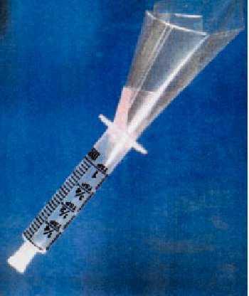 Fig. 1. Jeringa de 5 ml milimetrada, a la que se ha retirado el émbolo, con tapón en su porción inferior, con adaptación de cono de plástico para facilitar la recogida de saliva en las pruebas de flujo salival.