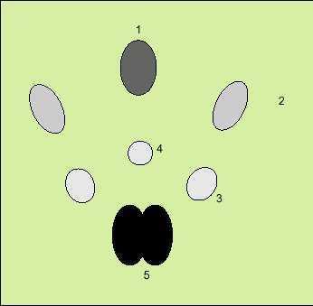 Fig. 3. Identificación de la anatomía en una gammagrafía salival normal, con detalles de captación de: 1) mucosa nasal; 2) glándulas parótidas; 3) glándulas submaxilares; 4) captación correspondiente a mucosa bucal, y 5) glándula tiroides.