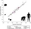 Comparación mediante escalas logarítmicas entre el peso corporal en gramos y el peso del cerebro en miligramos en 45 especies de primates. La línea (regresión) muestra el tamaño cerebral esperado para cada tamaño corporal. La X sobre la línea de regresión marca el tamaño esperado para el cerebro humano, lo que resulta mucho menor que el verdadero tamaño del cerebro humano actual, señalado con un cuadrado de líneas rojas. En general, los prosimios se ubican bajo la línea de regresión, en tanto que los antropoides se ubican sobre esta línea. Esta característica indica que hubo una presión selectiva para el desarrollo del tejido cerebral durante la evolución humana. Tomado y modificado de Stephan et al.7.
