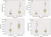 Os box‐plot relativos à figura 1C e D permitem uma comparação direta dos valores de β‐hCG e progesterona entre esses grupos. Parece verificar‐se uma diferença entre a distribuição dos valores de β‐hCG entre gravidezes evolutivas únicas e gemelares, mas não para os valores de progesterona. O valor médio de β‐hCG foi de 163 UI/L, no primeiro caso comparativamente com 331 UI/L no caso das gravidezes gemelares. Já o valor médio relativo ao doseamento de progesterona foi semelhante, 81,3ng/dL no primeiro caso contra 77,8 no segundo.