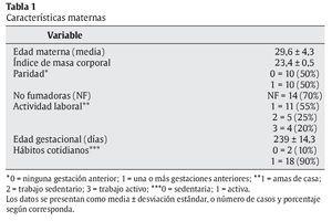 Fueron estudiadas 20 gestantes en el último trimestre, sin complicaciones ni contraindicaciones médicas para el ejercicio. Cada mujer firmó un consentimiento informado y completó una entrevista inicial en la que se obtuvieron datos de tipo médico (paridad, ganancia de peso durante el embarazo) y personales (ocupación laboral, tabaquismo, hábitos de actividad física, etc.) (tabla 1).