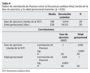 Como se observa en la tabla 4, no existe una correlación positiva entre los aumentos de FCF y la edad gestacional materna, según el valor ofrecido por el índice de correlación de Pearson (0,60).