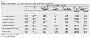 Las tablas 5 y 6 muestran que al realizar una comparación de medias entre los valores de la FCF en ambos grupos de paridad (primigrávidas y secundigrávidas), se observan diferencias significativas entre los grupos de estudio, tanto en la fase de 15 a 20 minutos de ejercicio (p = 0,002), como en la media del tiempo total del trabajo (p = 0,04); en ambos casos se encuentran mayores aumentos en mujeres secundigrávidas.