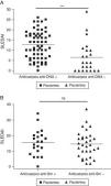 Los datos en la figura 4 muestran la asociación entre SLEDAI y anticuerpos anti-ADN y anticuerpos anti-Sm. Se encontró que los pacientes con anticuerpos anti-ADN positivos presentaban mayor índice de SLEDAI (p<0,0001); no se encontró asociación entre anticuerpos anti-Sm y SLEDAI. Para realizar el análisis de datos entre SLEDAI y anticuerpos anti-ADN, no se tuvo en cuenta la puntuación de dichos anticuerpos en la escala de actividad.