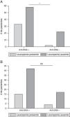 Asociación entre anticuerpos anti-ADN y leucopenia. A) La leucopenia y la presencia de anticuerpos anti-ADN se presentó en cualquier momento de la enfermedad; *p=0,0111. B) los datos fueron analizados cuando los exámenes de laboratorio (anti-ADN y recuento de leucocitos), se realizaron en el mismo tiempo; ns: no significación estadística.