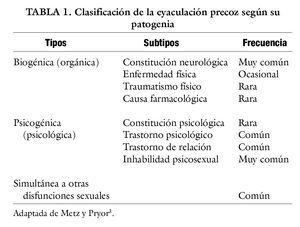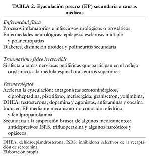 Metz y Prior proponen una clasificación etiológica3 (tabla 1), según la cual los subtipos más frecuentes de EP son los debidos a constitución neurológica facilitadora, trastorno psicológico o de relación de pareja, inhabilidad psicosexual, o simultánea a otros trastornos sexuales como la disfunción eréctil, a la que se asocia con frecuencia en varones mayores de 45 años4,5. Los casos de EP secundarios a causas médicas: enfermedad6-10, traumatismo físico11,12, o como consecuencia de efecto adverso farmacológico13-15, que se pormenorizan en la tabla 2, son poco comunes o raros, aunque los simultáneos a disfunción eréctil, a menudo de origen orgánico, son frecuentes.