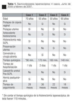 De junio 2005 a febrero de 2007, realizamos cuatro sacrocolpopexias laparoscópicas, por prolapso de cúpula vaginal: dos casos con antecedente de histerectomía y dos con prolapso uterino. A una paciente se le conservó el útero y a la otra se le realizó histerectomía en el mismo acto quirúrgico, por hipermenorrea y miomas grandes. Promedio de seguimiento: 26 meses (18 a 36 meses); promedio de edad: 60 años (50 a 70 años); promedio de tiempo quirúrgico: 142 minutos (90 a 170 minutos). En uno de los dos casos de prolapso de la cúpula vaginal, hubo necesidad de convertir la cirugía en abierta, ya que, posterior a la disección de la vagina y fijación de las mallas a la misma, nos fue imposible disecar con seguridad el sitio donde se fija al sacro, debido a que la mesa quirúrgica no alcanzaba la posición de Trendelenburg adecuada; la paciente presentaba obesidad importante y talla baja. Por medio de una incisión supra e infraumbilical en la línea media, de aproximadamente unos 10 cm, se fijó la malla con ayuda de separadores de cirugía abierta. Su evolución fue satisfactoria y sin complicaciones. Se egresó a las 48 horas. Los otros tres casos se egresaron al día siguiente. No hubo recurrencia del prolapso genital en ninguna de las cuatro pacientes.